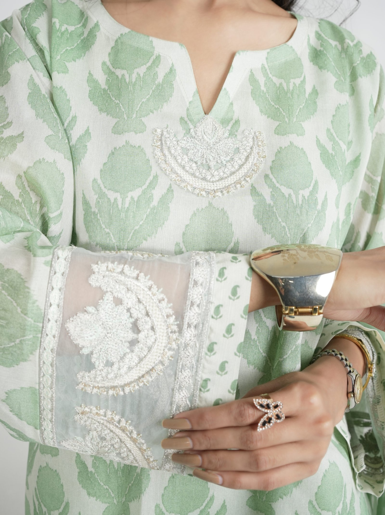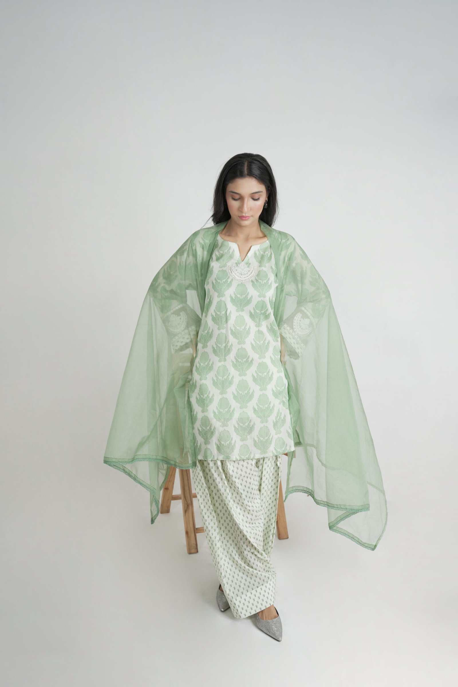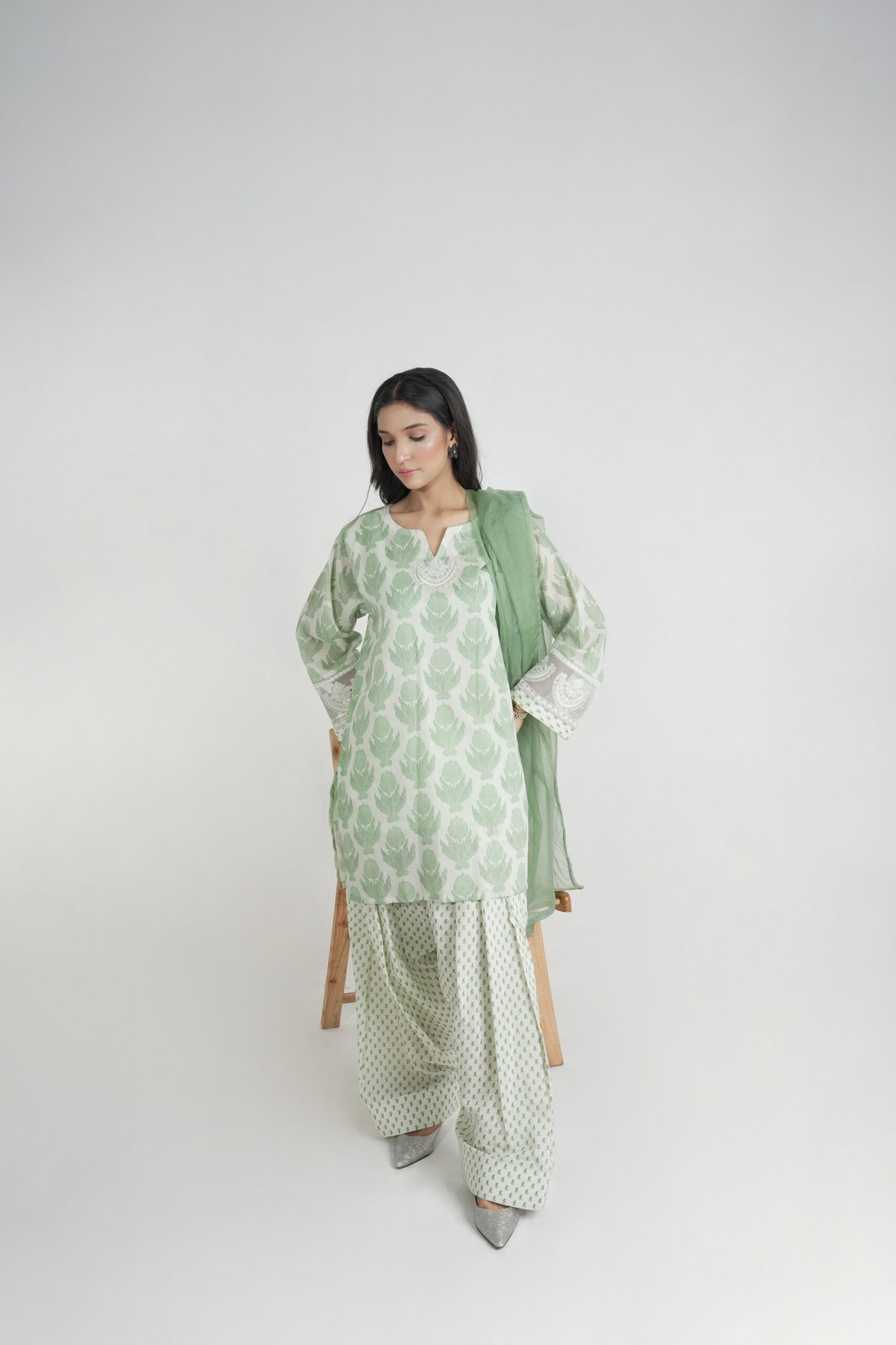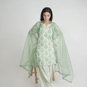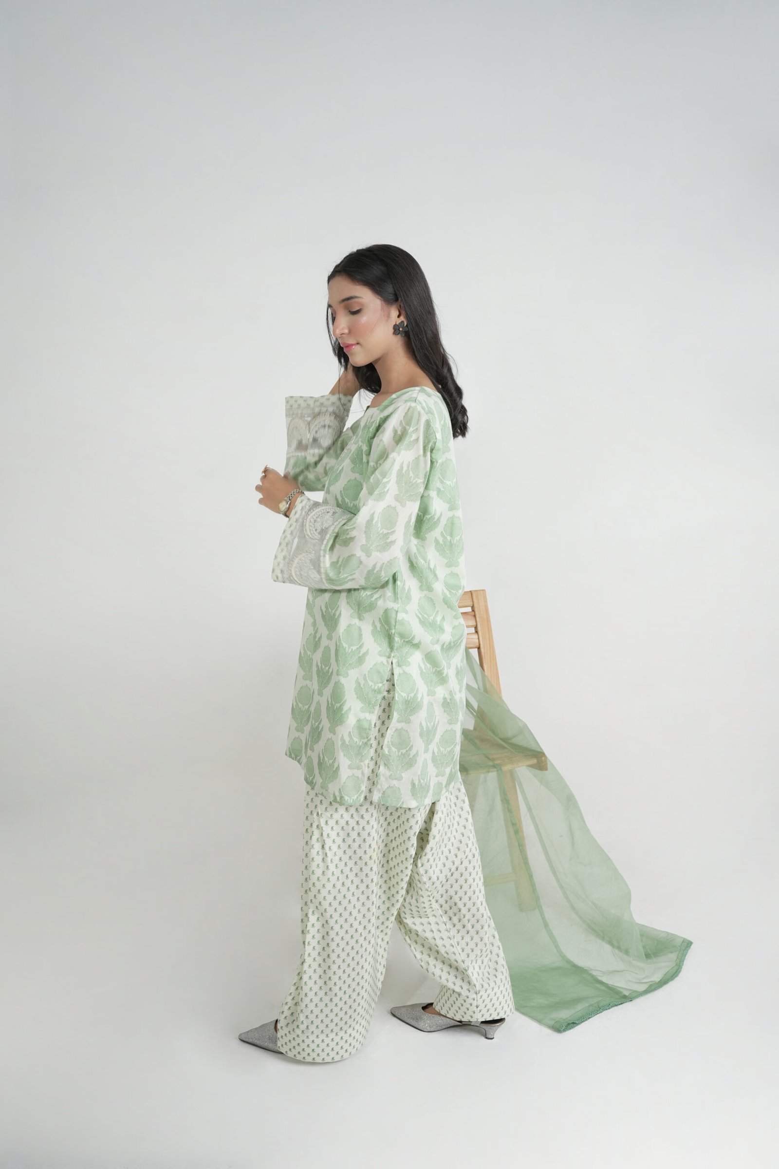 A graceful 3-piece lawn suit in a refreshing light green hue, featuring a leaf print shirt with delicate embroidery, printed trousers, and a sheer organza dupatta.